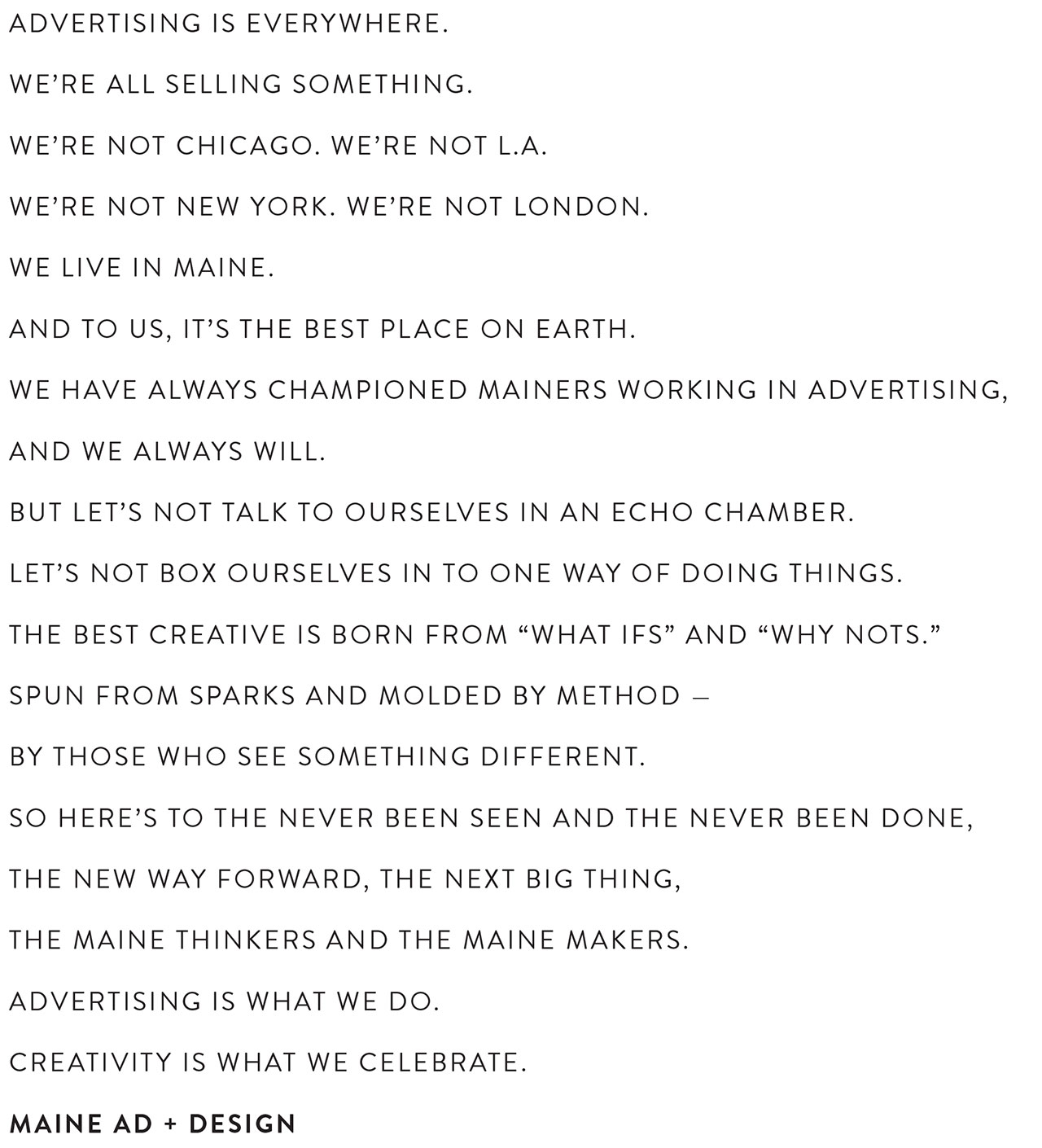 The new name, Maine Ad + Design, or “MADE” for short, leans into the ascendancy of the design community while cutting the antiquated word “club,” which felt too exclusive. The four-letter acronym also cleverly incorporates three separate references—ME, for Maine; AD, for advertising; and MADE, honoring the makers of the creative industries.