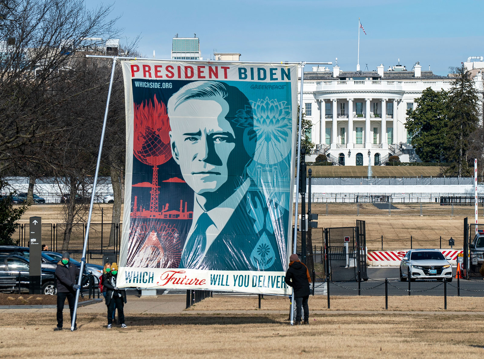 Greenpeace began sharing its Biden design across the world in recent days. Here’s a 20-by-15-foot banner outside the White House: