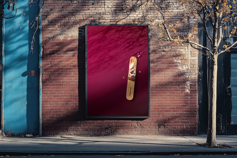 “We did some early test shots to sell the idea,” he recalls. “I went to my local, picked up a box, ate three in one sitting—which was a bit much—and then shot them on my iPhone while there was some nice light coming through my kitchen. Then I added the iconic Häagen-Dazs color—and boom! It worked surprisingly well.”