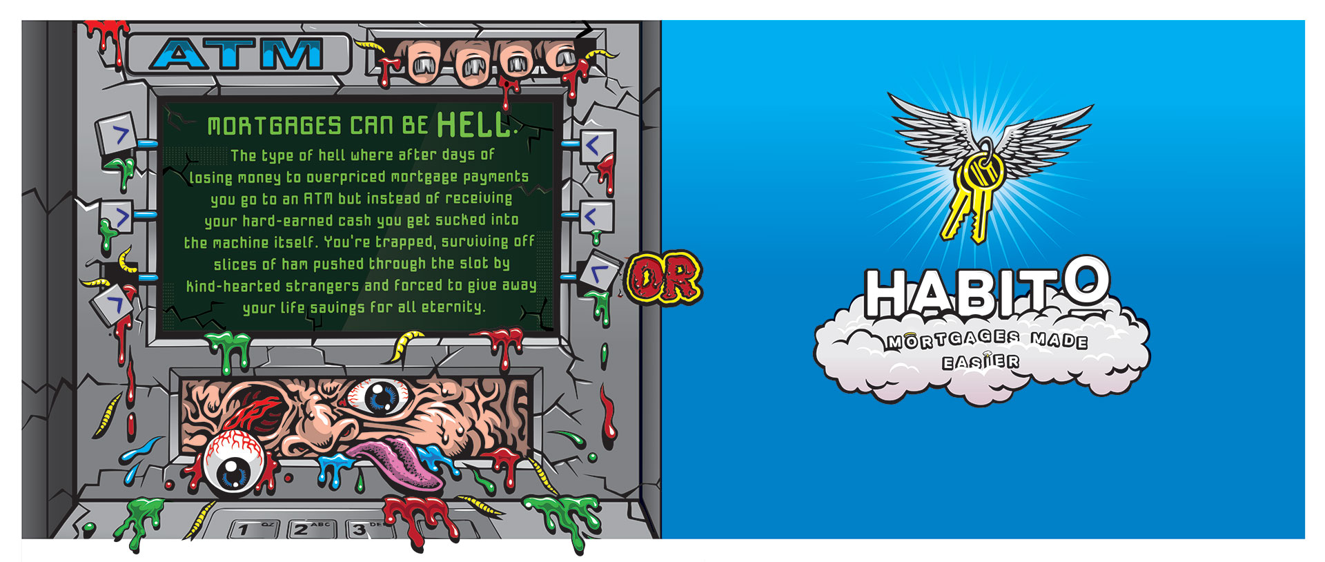 In a very nice addition to the campaign, Uncommon brought in California artist Jimbo Phillips to made some crazy out-of-home work. The longer-copy ads also emphasize the hellish ordeal of finding a mortgage—in Phillips’ signature style.