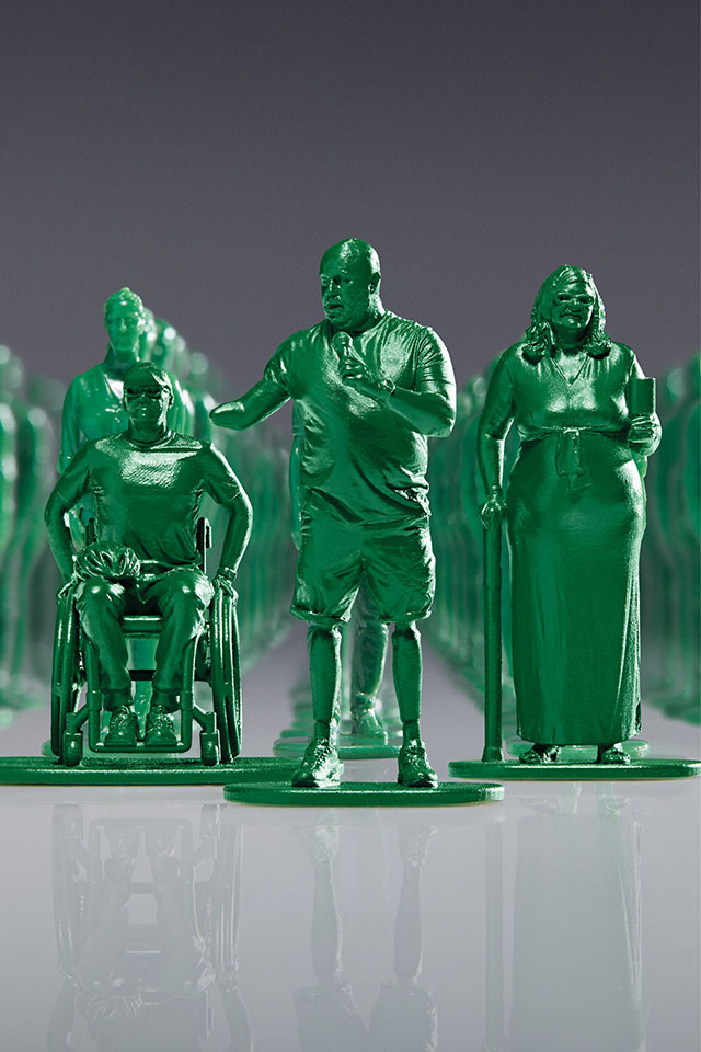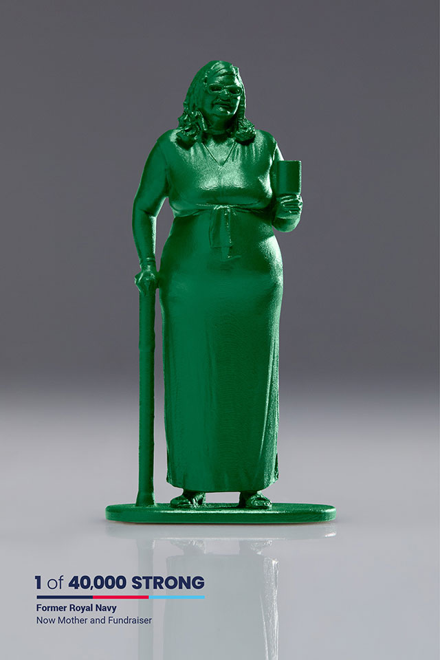Most of the “40,000 Strong” stemmed from nine bespoke designs, he says, “which are injection moulded figures, just like regular toy soldiers. Thirty percent of them are female and 70 percent male, reflecting the gender split of wounded U.K. veterans.”