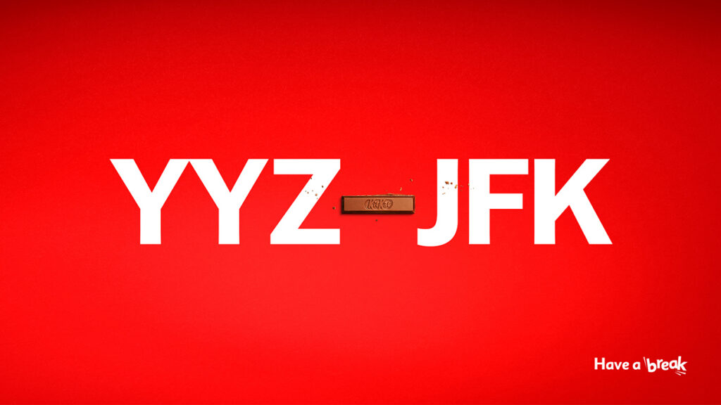 Whether it’s during work, travel, streaming or watching a sporting event, is there ever really a bad time for a KitKat? “9-5,” “Ep.8-Ep.9,” “7th inning-8th inning” and “YYZ-JFK” ads each have the dashes replaced. (And special thanks to Rush for teaching me all about YYZ.)