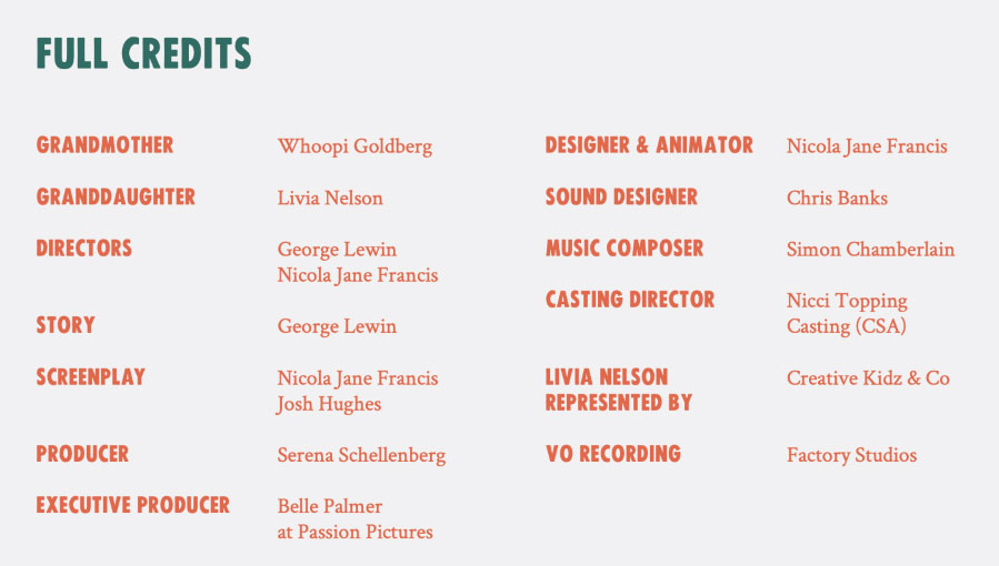 To deliver that message, Francis used 2-D frame-by-frame techniques in Photoshop, striving for a textured, handmade feel. “The colors play a huge part,” Lewin says. “The interior scenes with our grandmother and granddaughter are very neutral. However, the story-world evolves and blooms with blues and corals as the granddaughter breathes life into it through her imagination. This use of contrast aims to really hit home with the audience about what could be our future.”