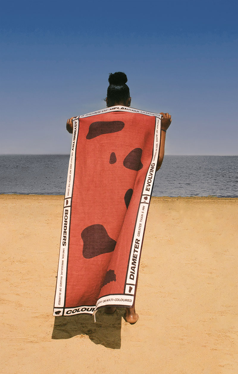 “The towel was inspired by the markings of a really popular animal print—cheetah,” says Young. “We could see how the spots could be easily translated into moles. Growing up in a generation where getting the ‘perfect’ suntan was socially desired, we had previously looked into skin safety and knew about the warning signs to look out for. So we created our own pattern using these signs to create a useful and educational beach towel, making it easier to check yourself.”