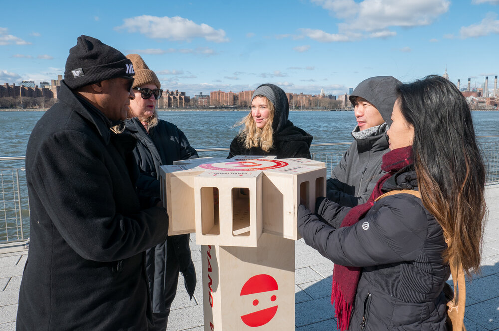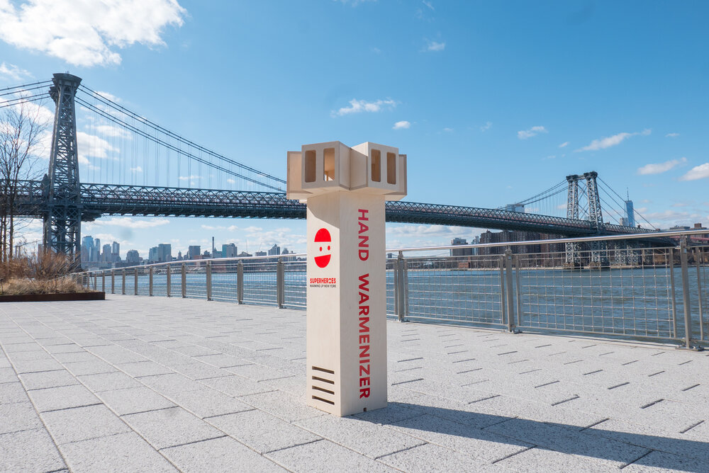 On a frigid day in late January, the creative shop teamed up with artist George Barratt-Jones to install a “Hand Warmenizer” in Domino Park. Made of reinforced plywood, the device stood four feet high, with an electric heater fan deep inside, and slots on top to accommodate up to 12 cold hands.