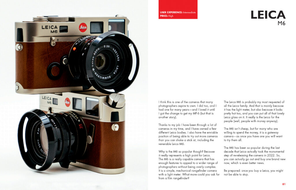 There are red tabs at the top of each page noting the level of user experience—low, intermediate or high—someone purchasing a particular camera should have. Can you talk about why you wanted to make sure to share that information? It’s a great idea. I have had friends who have purchased expensive film cameras only to give up on them because a) the camera operation is too complex for their skill level and/or b) they aren’t interested in learning what they need to know.