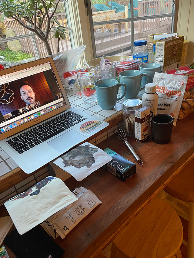 I was having a great time sipping my delicious drinks and following along in the class when Aran mentioned he was trained in the art of tasseography, or coffee-ground readings. He called his first participant, and as she held her coffee cup up to her camera, Aran correctly guessed where she last vacationed and the type of dog she had. Sure enough, Aran then asked me to unmute and said I was up next. As I held my mug to my screen, Aran also narrowed in on where I’m based and what I do for work. Coffee me impressed!