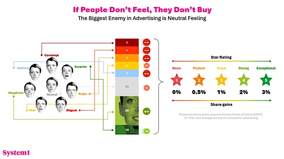And here’s the reality check: most advertising is neutral. Around half of all ads sit squarely in the middle on emotional response. Just 1 percent create the kind of feeling strong enough to separate a brand from its competitors and deliver meaningful market share growth of around 3 percent.
