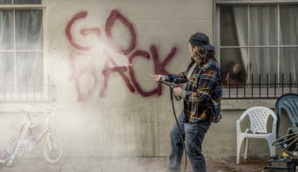 The legendary Man in Black strums that guitar with the power of a full church choir. It’s riveting. Best possible music choice right there, boosting the notion of personal devotion empowering believers and their broader community.
